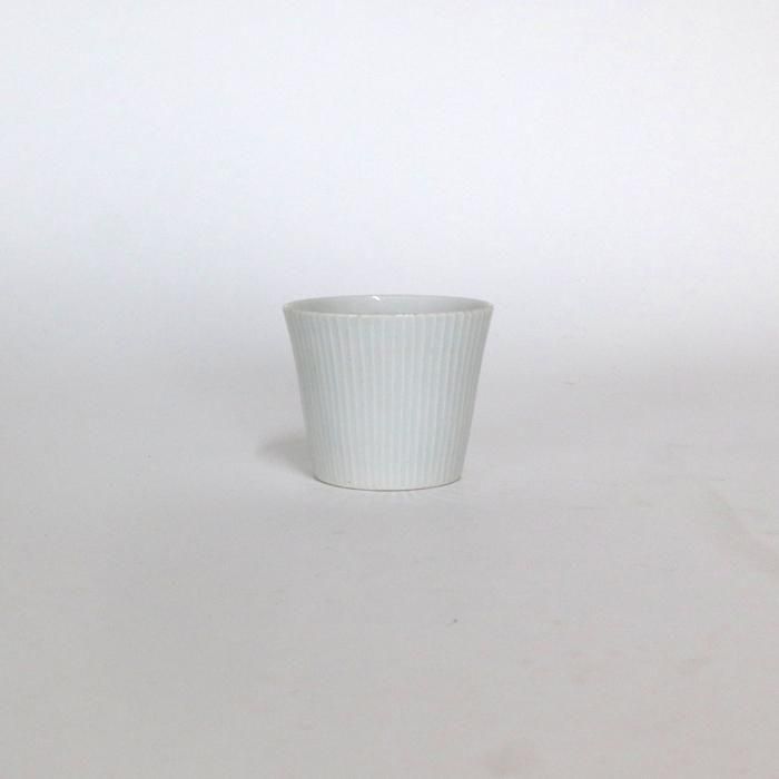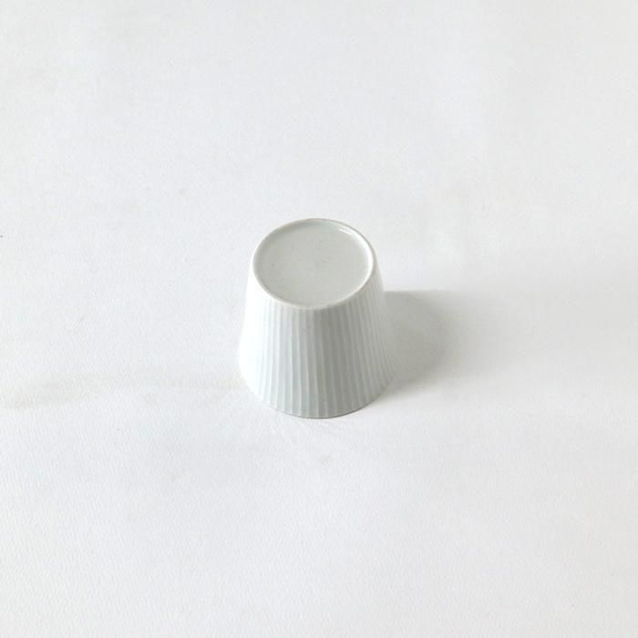 村上雄一さんは、陶器、磁器、半磁器といったさまざまな素材の多彩な器を作陶されていますが、こちらは美しい白磁にしのぎを入れて凹という名称通り縦に陰影入れて窪ませた奥ゆかしい縞模様となっています。