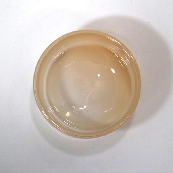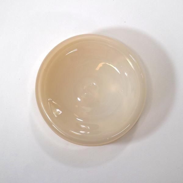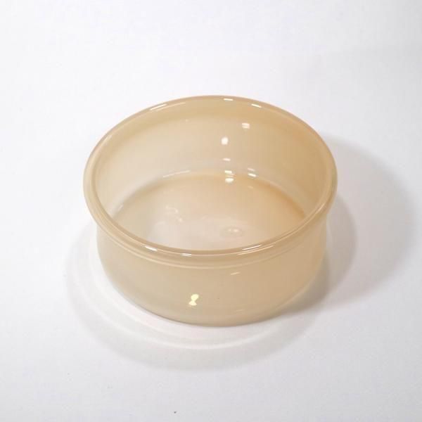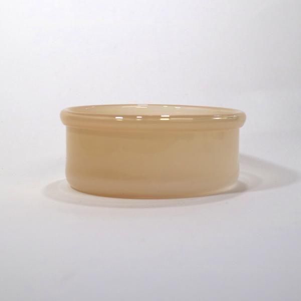 リブフラットボウル/モカシンは、銅鑼鉢のように口径が大きく背の低いシリンダーシルエットに口部分の端を折りたたんでぽってりと厚みをもたせた不透明カラーガラスのベージュがかったピンクとなっています。
