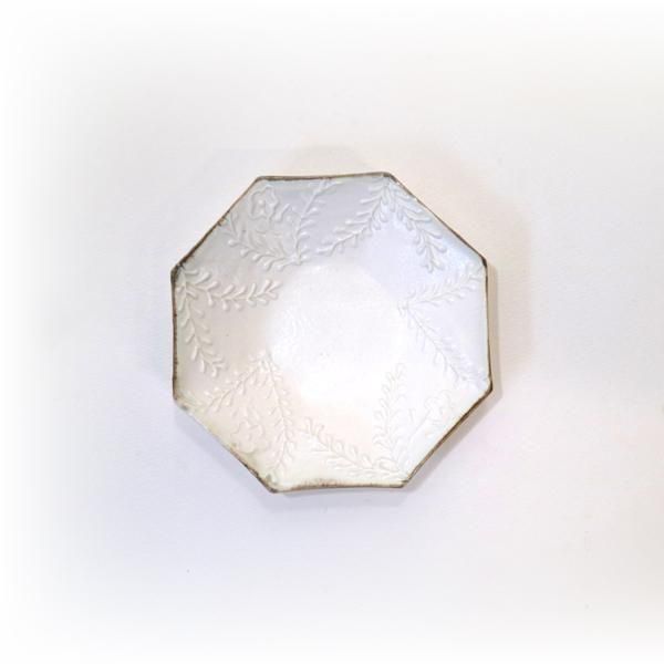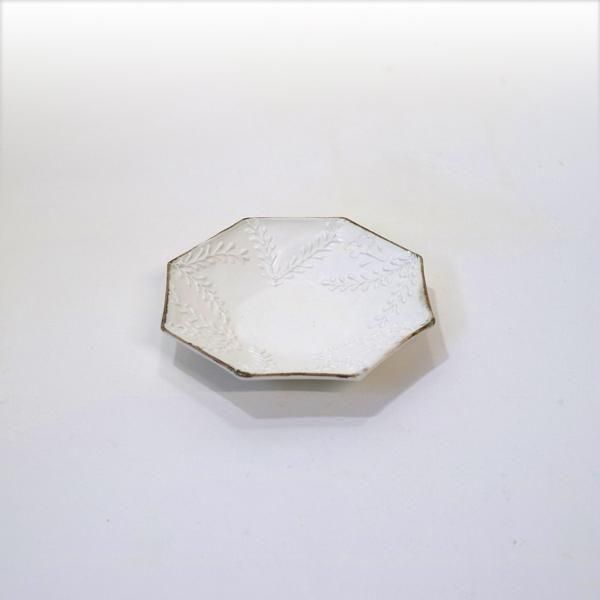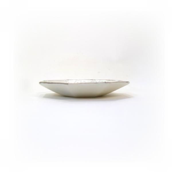 沖縄県立芸術大学陶芸コース卒後、沖縄の工房を経て、現在千葉の工房にて作陶されています中村かおりさんのローズマリー八角ソーサー小皿/白です。