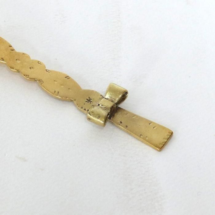 ハンドル部分は縦にスカラップ状となっていて、その縁に沿って文様や中心部分に細かな文様が入っていて、ハンドルエンド付近にリボン飾りとなっています。