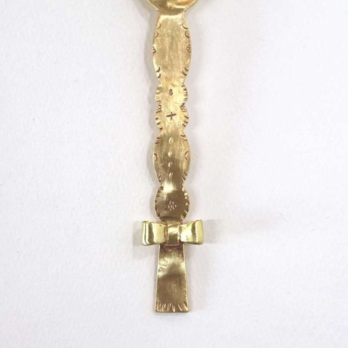 ハンドル部分は縦にスカラップ状となっていて、その縁に沿って文様や中心部分に細かな文様が入っていて、ハンドルエンド付近にリボン飾りとなっています。