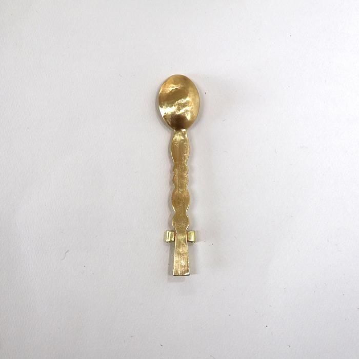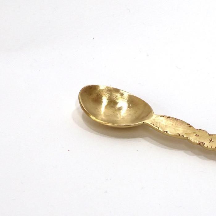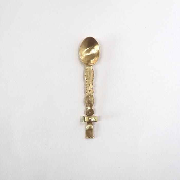 金属で大きなモニュメントなどを制作するBONZE工房にてアシスタントされた後独立し、埼玉の工房にて「口当たりの良い、楽しいカトラリー」を心がけて製作されていますitto/イットさんの真鍮できたリボンデザートスプーン/6です。