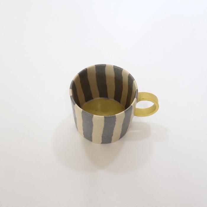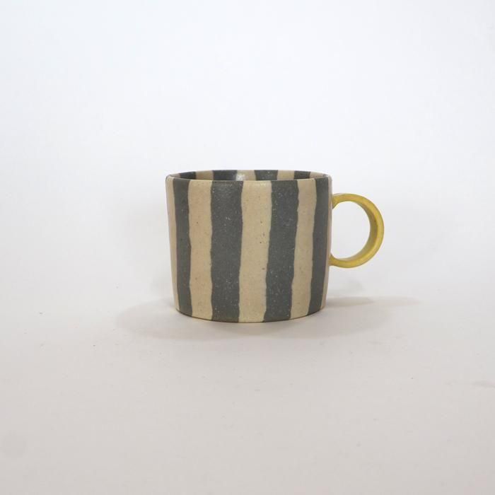 岡山県立大学で学ばれ、鳥取の工房で練り込み技法を駆使して製作されています田中ちあきさんのエクリュ(生成り)とグレーの太めのストライプ、ハンドルと底面が黄色の練り込みフストライプマグです。