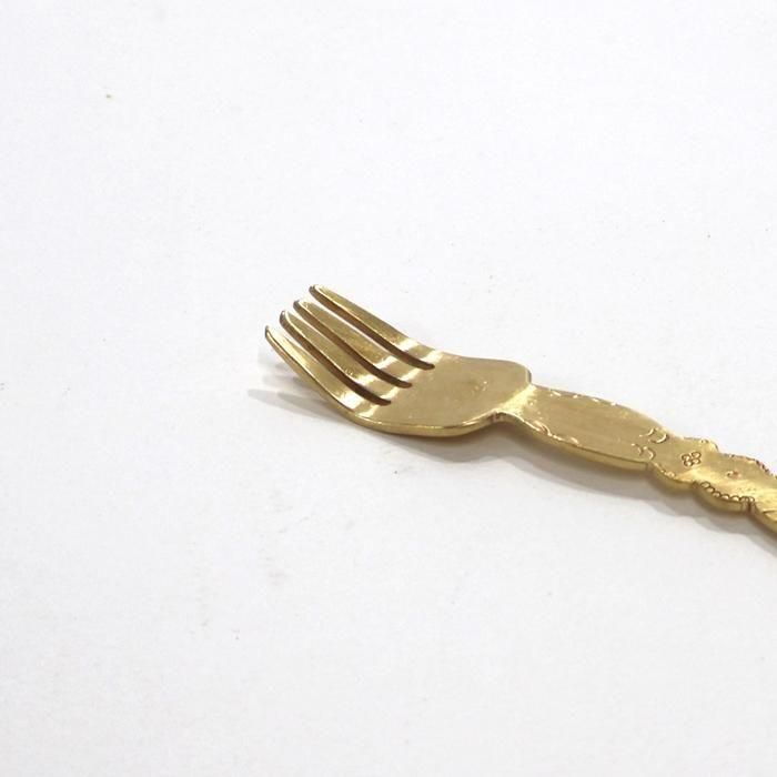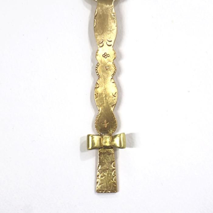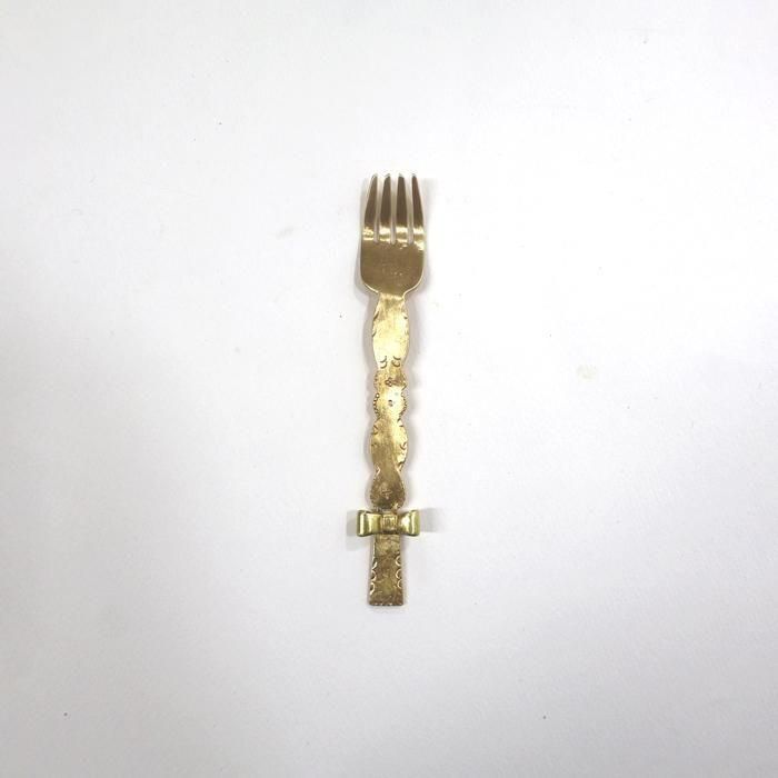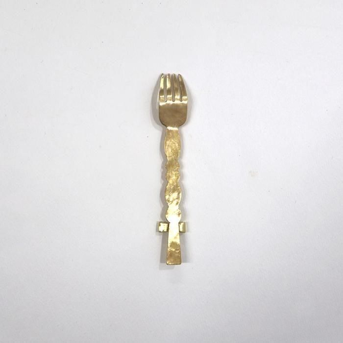 金属で大きなモニュメントなどを制作するBONZE工房にてアシスタントされた後独立し、埼玉の工房にて「口当たりの良い、楽しいカトラリー」を心がけて製作されていますitto/イットさんの真鍮できたリボンデザートフォーク/2です。