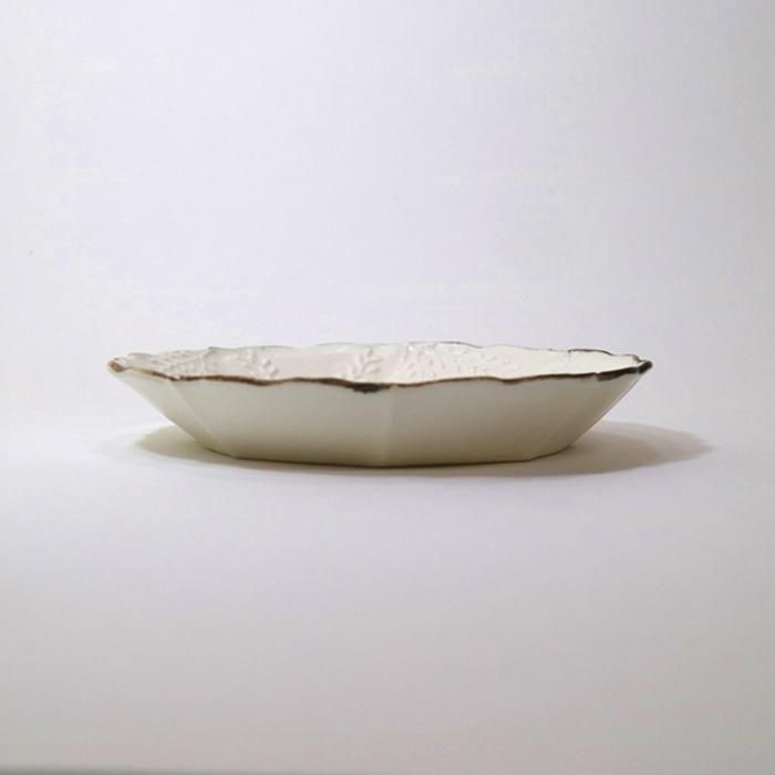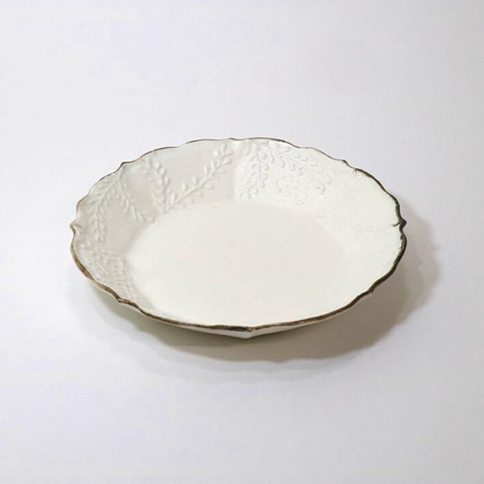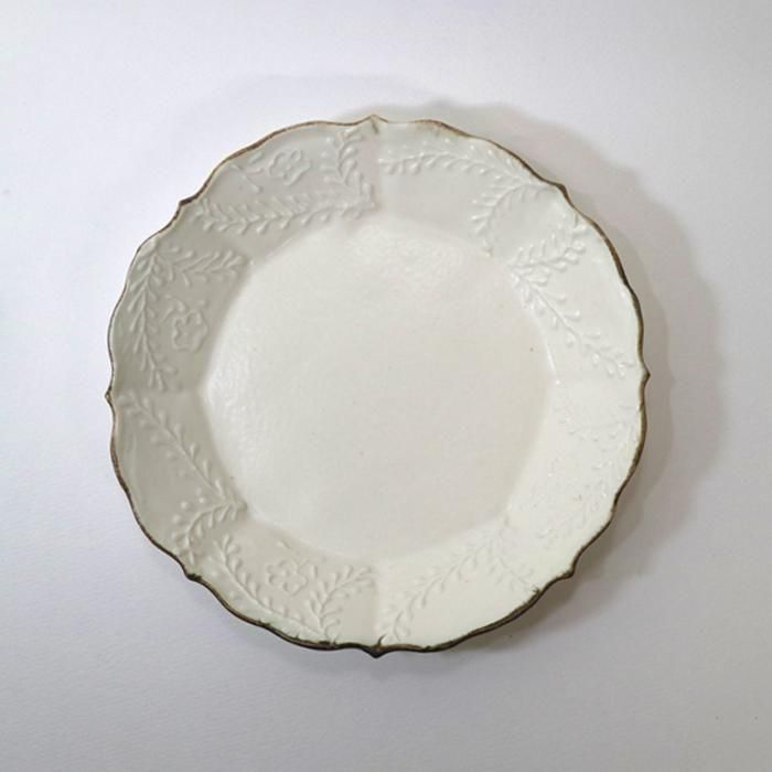ローズマリー6寸丸皿/白は、八角皿のように八等分された縁の内側にイッチンで施されたローズマリー文様が白は比較的クリアとなっています。