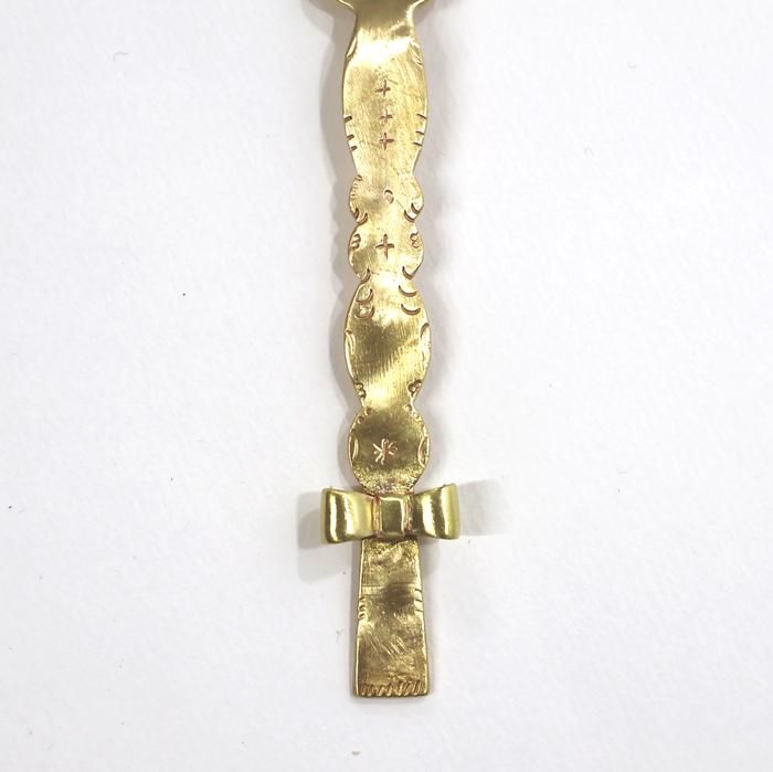ハンドル部分は縦にスカラップ状となっていて、その縁に沿って文様や中心部分に細かな文様が入っていて、ハンドルエンド付近にリボン飾りとなっています。