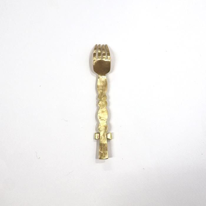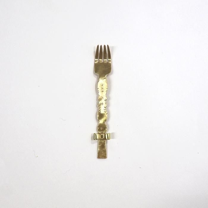 金属で大きなモニュメントなどを制作するBONZE工房にてアシスタントされた後独立し、埼玉の工房にて「口当たりの良い、楽しいカトラリー」を心がけて製作されていますitto/イットさんの真鍮できたリボンデザートフォーク/6です。
