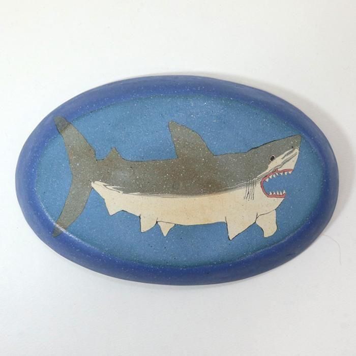 この練り込みサメ皿は、恐ろしいサメをちょっとチャーミングに歯や両側に5対ある鰓孔、背ビレ、尾ビレまで細かく丁寧に練り込み技法で施表現されています。