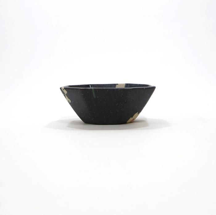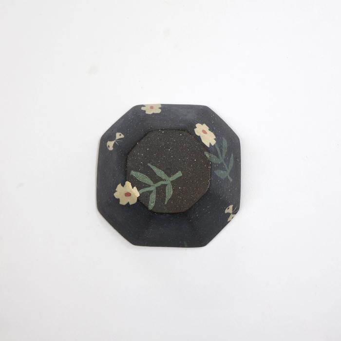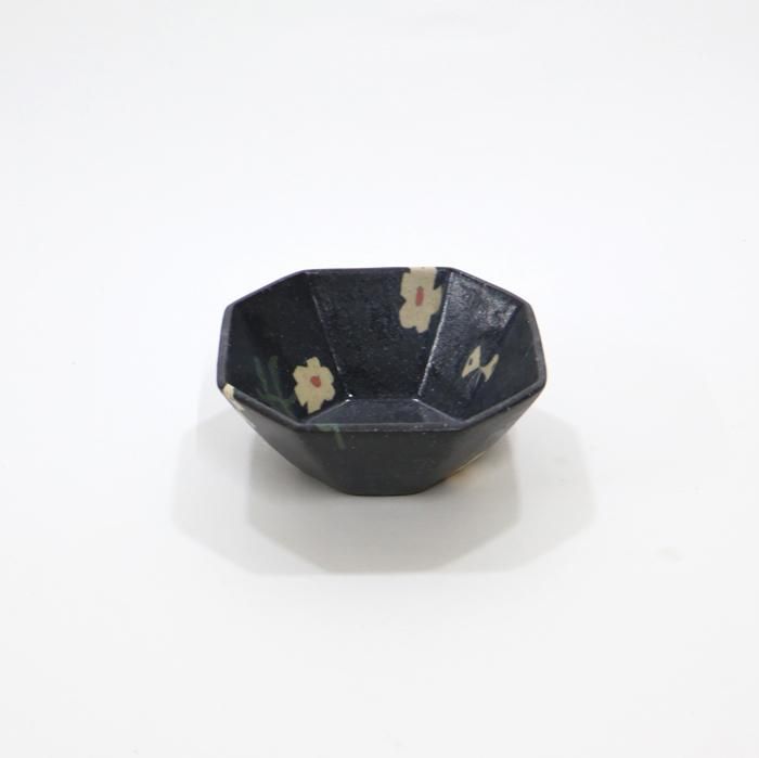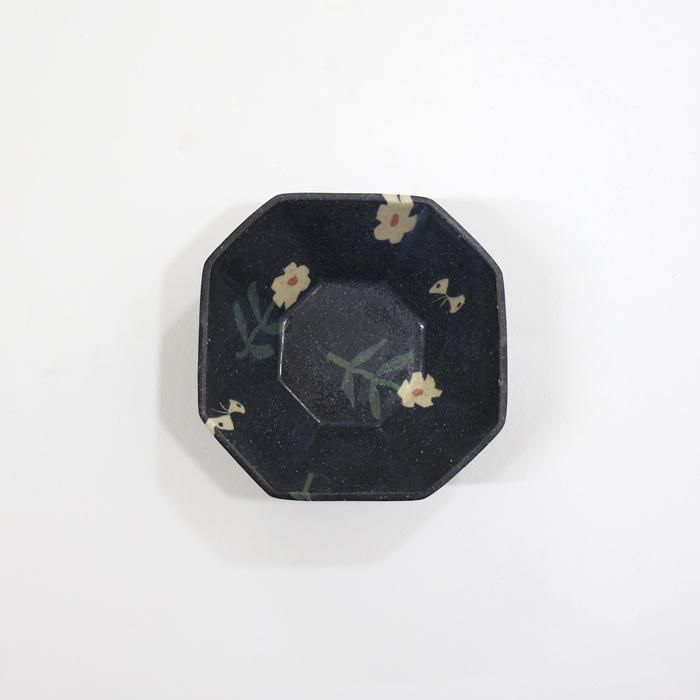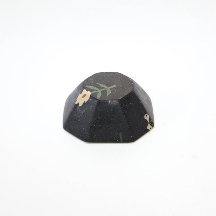 岡山県立大学で学ばれ、鳥取の工房で練り込み技法を駆使して製作されています田中ちあきさんの新作「花とチョウシリーズ」から黒ベースにマーガレットのような白い花、白の蝶々が散らされた練り込み花とチョウ小鉢/黒です。