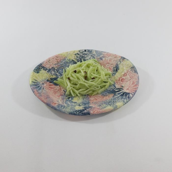 中村かおりさんの器といえばイッチンでローズマリーなど植物が模様付けされたエレガントな器を想い起される方が多いと思いますが、このタカラモノプレートのようなアーティスティックな一面も楽しんでいただければと思います。
