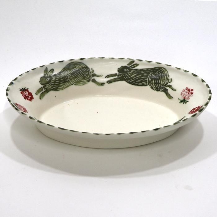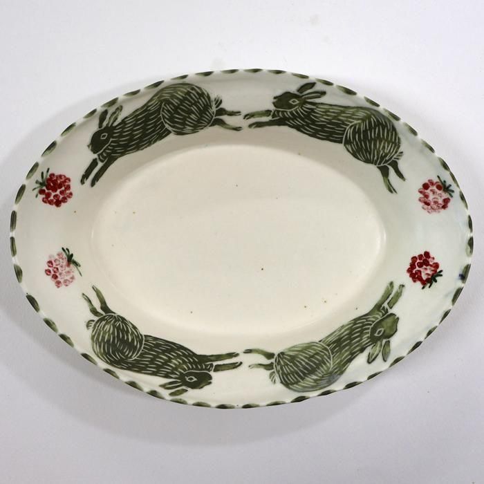 沖縄県立芸術大学陶芸コース卒後、沖縄の工房を経て、現在千葉の工房にて作陶されています中村かおりさんのうさぎオーバル深皿/碧です。
