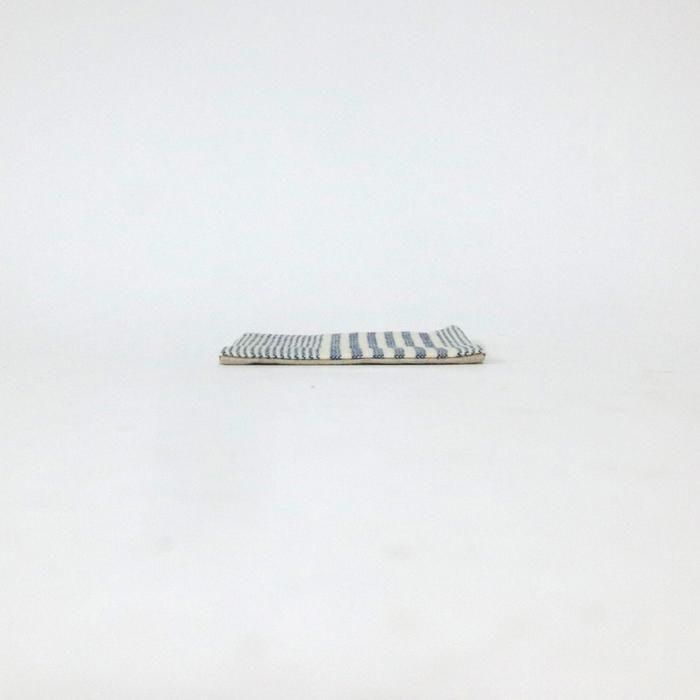 手織りコースター/シングル/1は、片面は生成りと蓼藍で染めだした淡い水色の太さが2種類の縞模様、もう一方の面は生成りのヘンプとなっています。