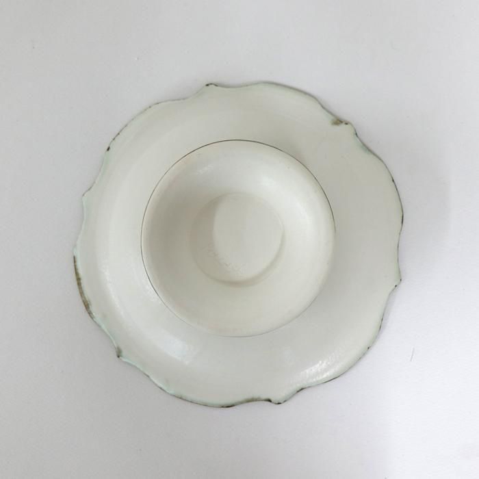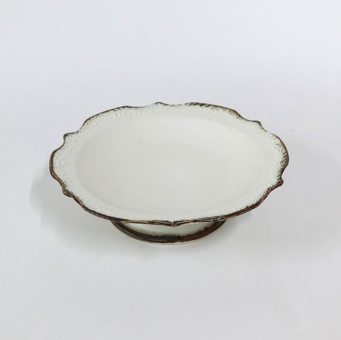 コンポート、テーブル部分はしっとりとした鉄で拭いた白の縁にイッチンで可憐な文様を入れて、しっかりとした安定感のあるボトムの上下の縁はさらさらとしたブロンズとなっています。