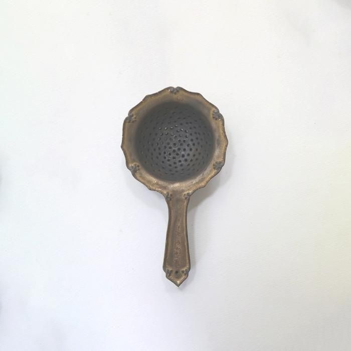 ポットのお茶をカップに移す折にシックなブロンズカラーですがやっぱりロマンチックな縁を輪花にしたストレーナーです。