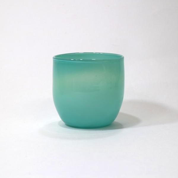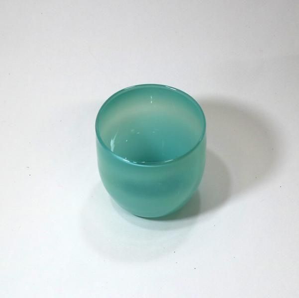 丸コップ/セラドングリーンは、コップがシュっとしたテーパードシルエットに対して丸みを帯びたふっくらとしたシルエットにペールブルーとグリーンを混ぜた不透明カラーガラスとなっています。