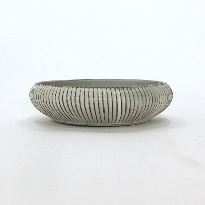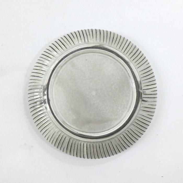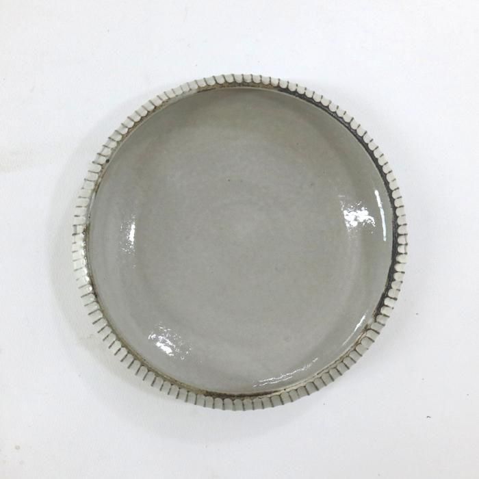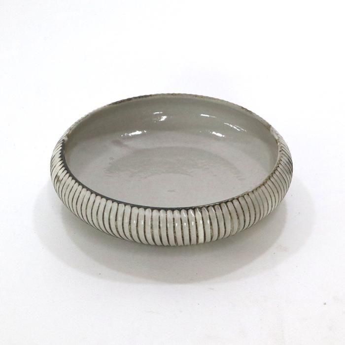 主に轆轤で成形し、美しい鎬(しのぎ)文様を施した器を製作されている小倉夏樹さんの新作の粉引き鎬(しのぎ)6.5寸丸深皿です。