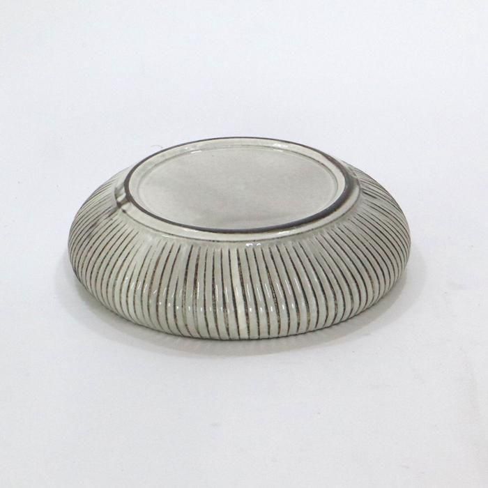 この粉引き鎬(しのぎ)はまず轆轤で縁を内側にいれるように成形した浅鉢と言っても過言ではない高さの外側側面にいっぱいに細かい鎬(しのぎ)を施してあります。