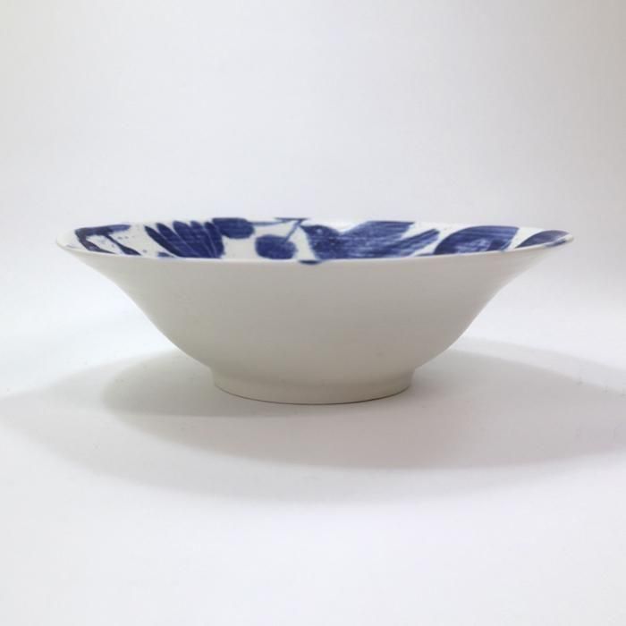 花鳥呉須大鉢はマットの中村かおりさんの拘りの美しい「白」の白磁の生地で成形された大鉢の口縁に沿って美しい白磁に映えるくっきりとした呉須で爽やかに花と鳥が描かれています。