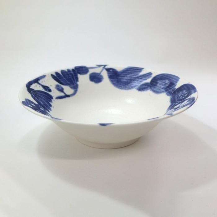 沖縄県立芸術大学陶芸コース卒後、沖縄の工房を経て、現在千葉の工房にて作陶されています中村かおりさんの白磁に呉須で花と鳥が描かれた清々しい花鳥呉須大鉢/Bです。