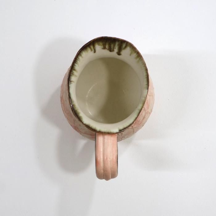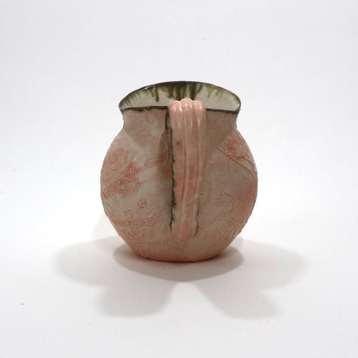 口部分とハンドルの縁を鉄でトリミングされているピンクの丸ピッチャーは鋳込み成形となっています。