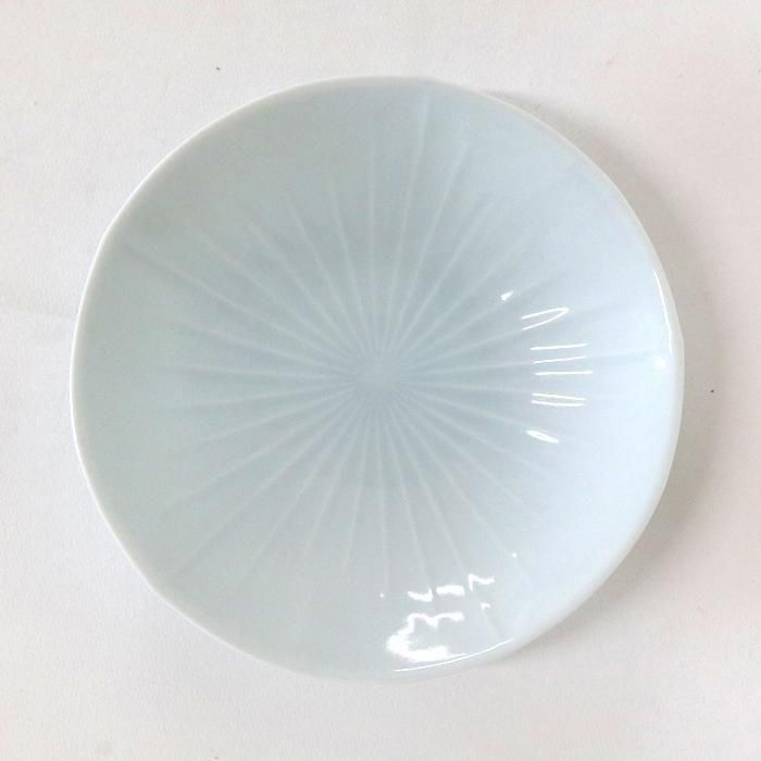 円形でなく、裏面からご覧いただくと分かり易いのですが五角形を緩やかに丸くした光沢のある青白磁の浅鉢の見込中心みから縁に向かって放射線状に長短の鎬(しのぎ)が入っています。