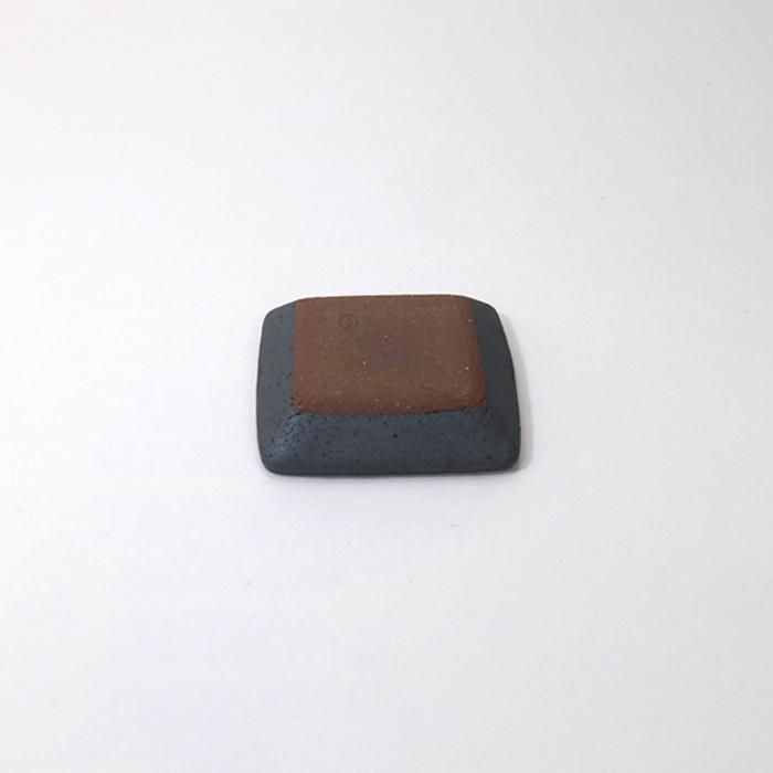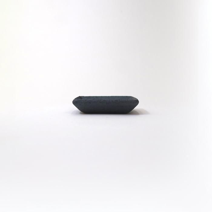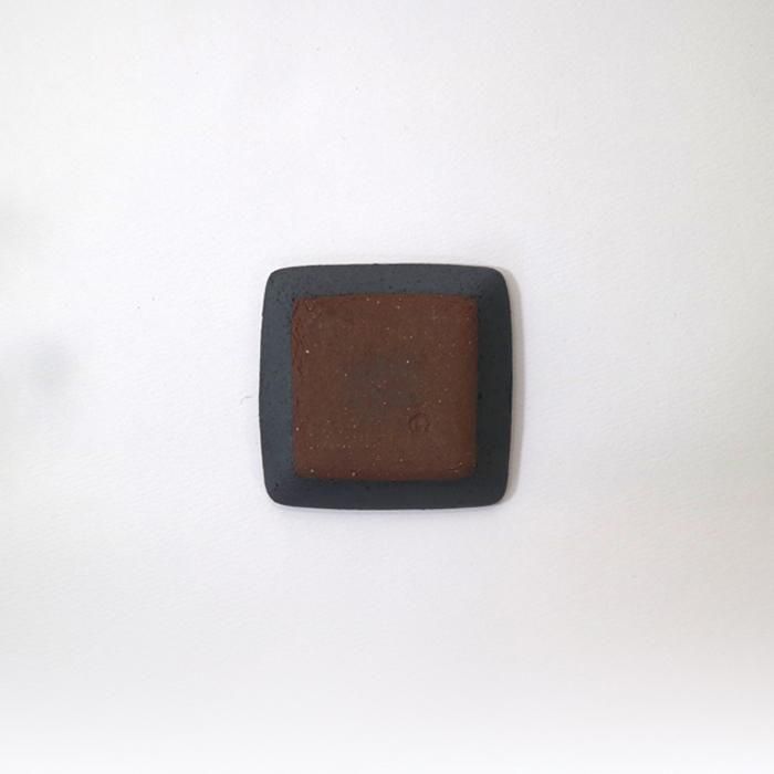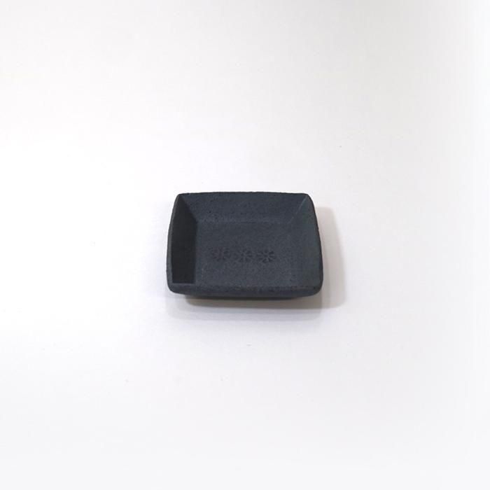 戸津圭一郎さんの黒花文角まめ皿はさらさらとした黒の生地の見込み中央に花文が三つ押印されています。