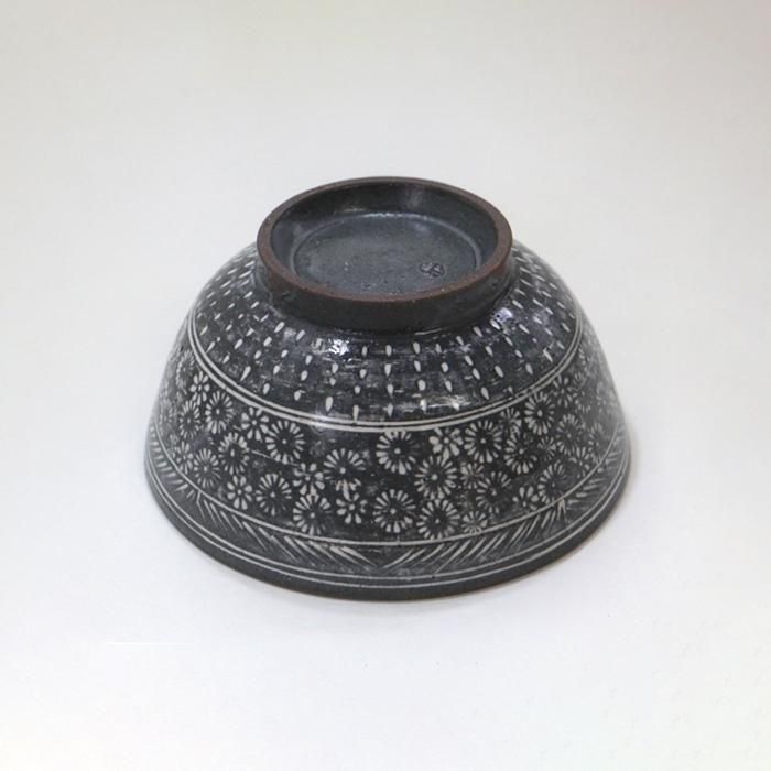 この象嵌どんぶりは、赤土をベースに1号釉(透明度の高い透明釉)を施釉し、外側側面を三段に分け、上段は彫り三島、中段は大中小のお花の印判が押印され、下段は飛び鉋となっています。