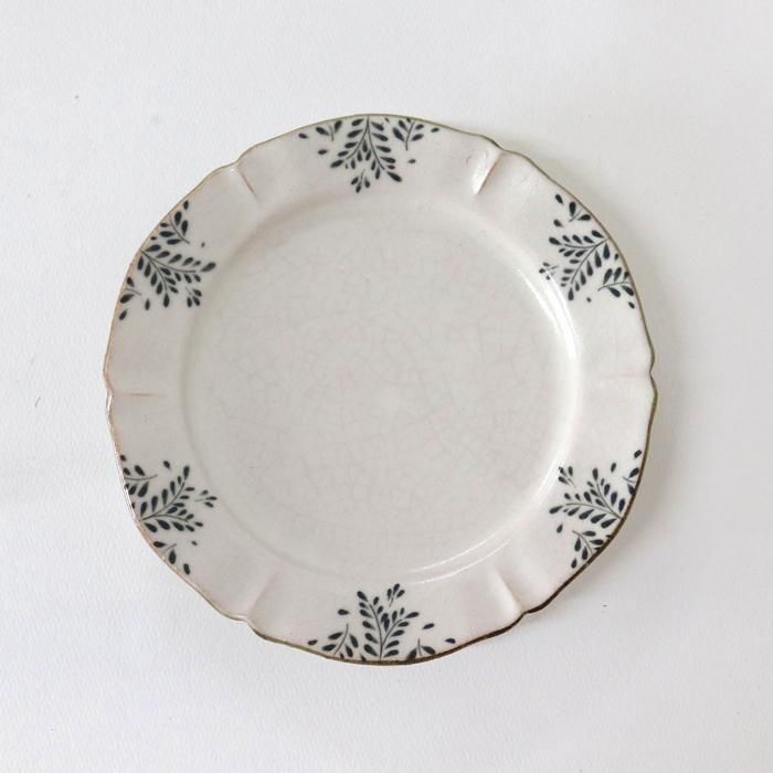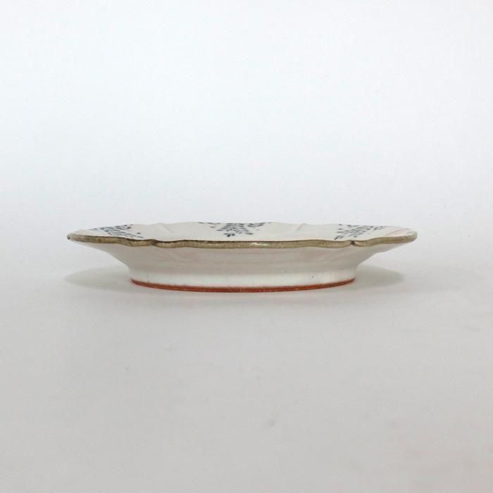 真っ白でなくナチュラルな生成りの地色に鉄を多めに加えた灰みがかった呉須でリム部分に草花文様が絵付けされています。