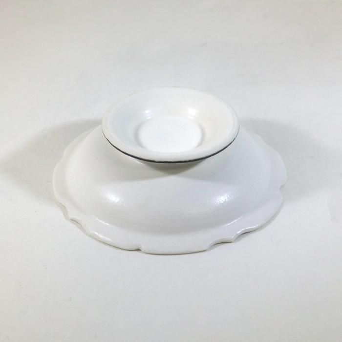 コンポート、テーブル部分はしっとりとした白の縁にイッチンで枝葉を思わせる楚々とした連続文様を入れて、しっかりとした安定感のあるボトムの縁はさらさらとしたブロンズとなっています。