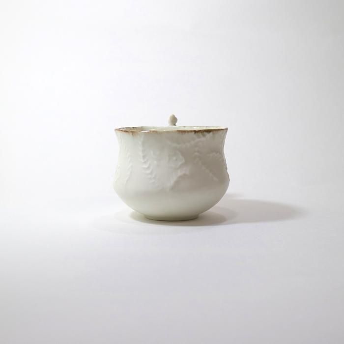 中村かおりさんが「抜けるような白にしたい」と拘りをもって色出しされたマットホワイトの地色にイッチンで繊細なローズマリー文様が施されています。