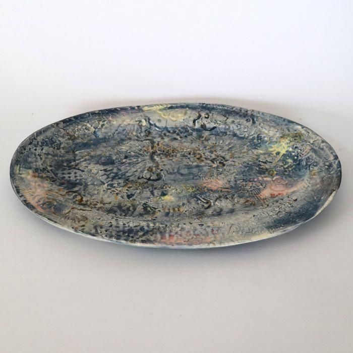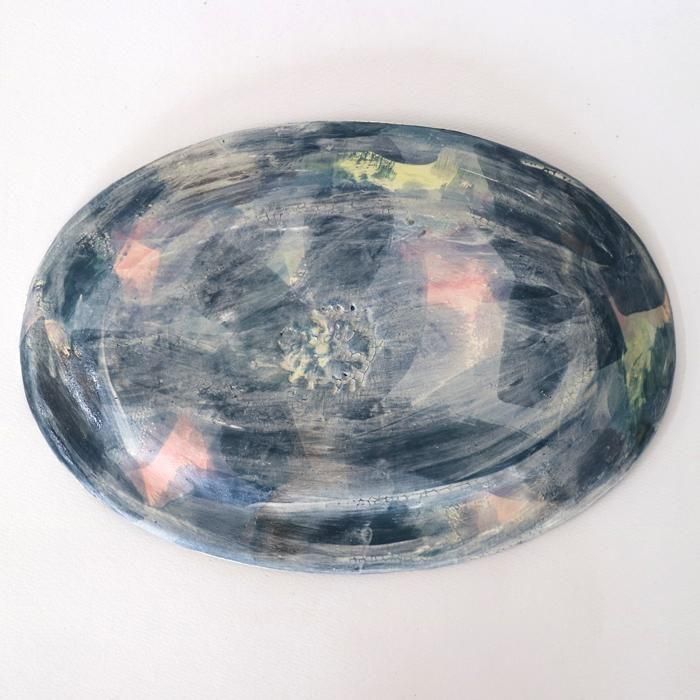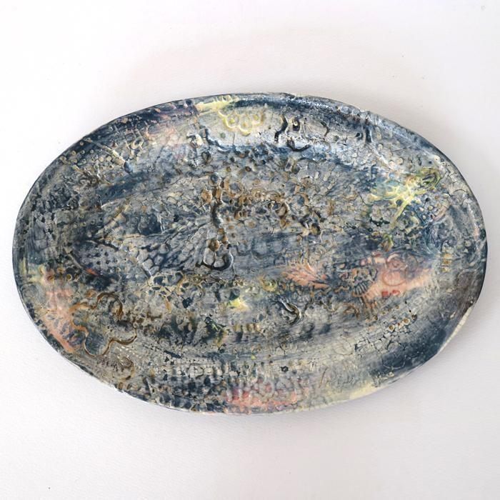 沖縄県立芸術大学陶芸コース卒後、沖縄の工房を経て、現在千葉の工房にて作陶されています中村かおりさんの「宝探し」が楽しい彩り豊かな「たからものオーバルプレート/3」です。
