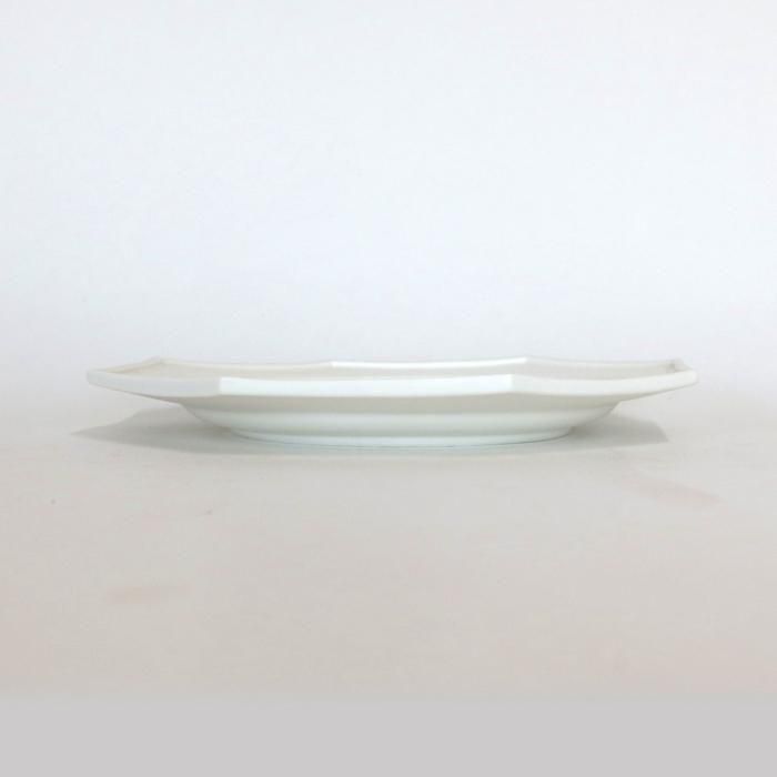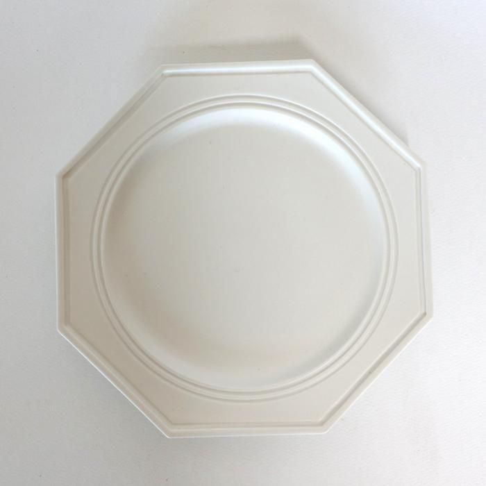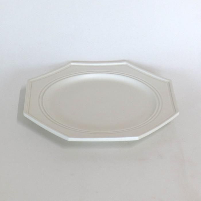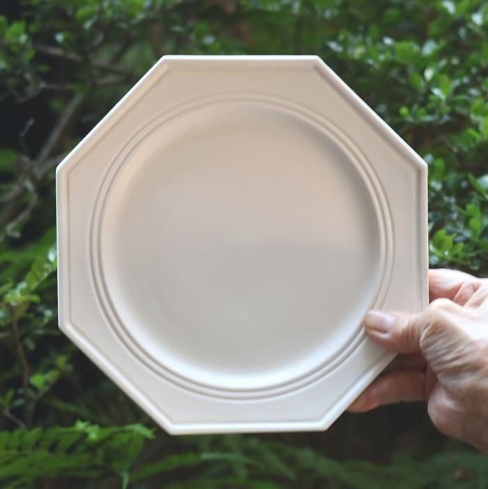 東京デザイナー学院でグラフィックデザインを学んだ後、砥部の自宅工房にて白磁の器を中心に制作されているシックな21センチオクトゴナルプレート/艶消しです。
