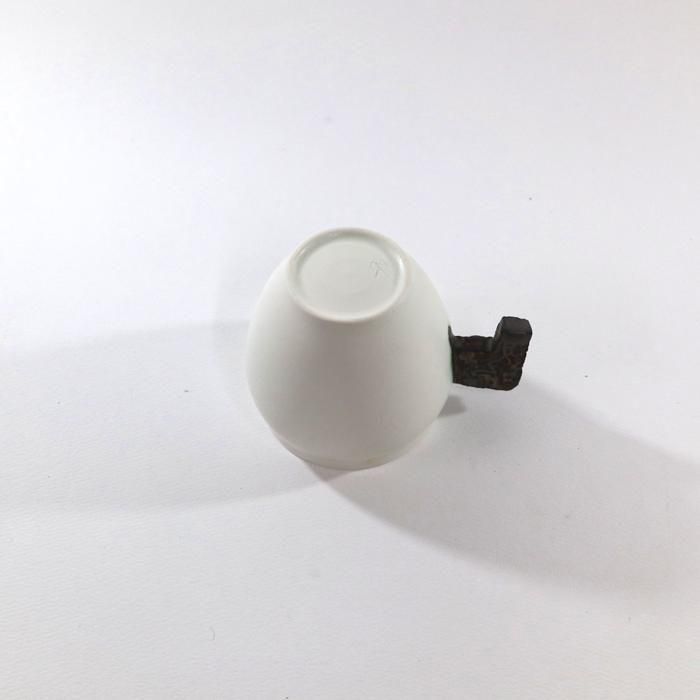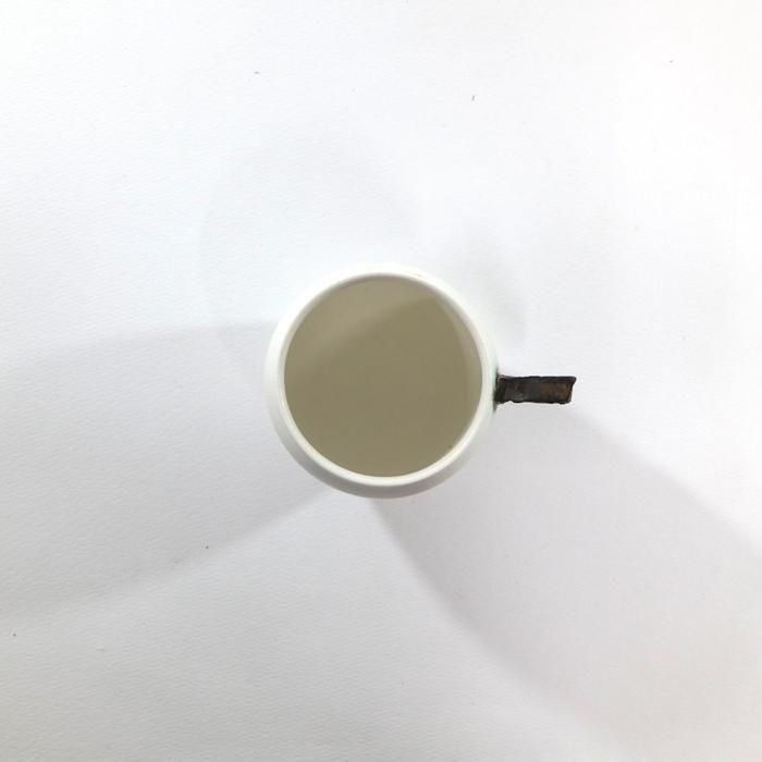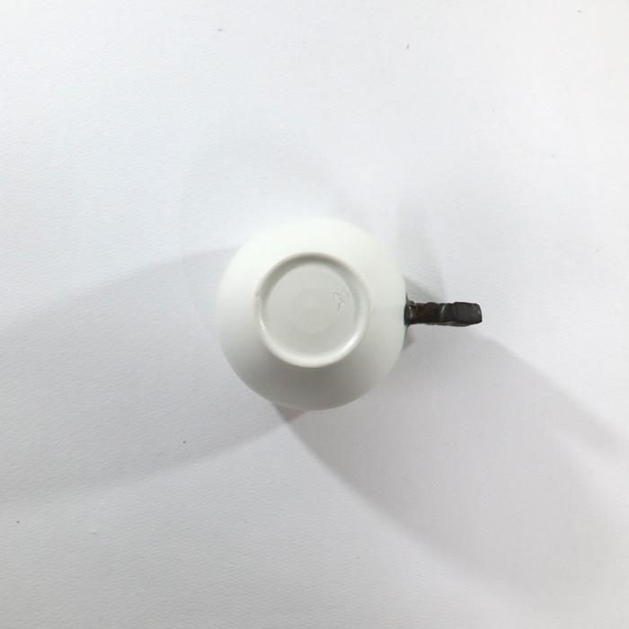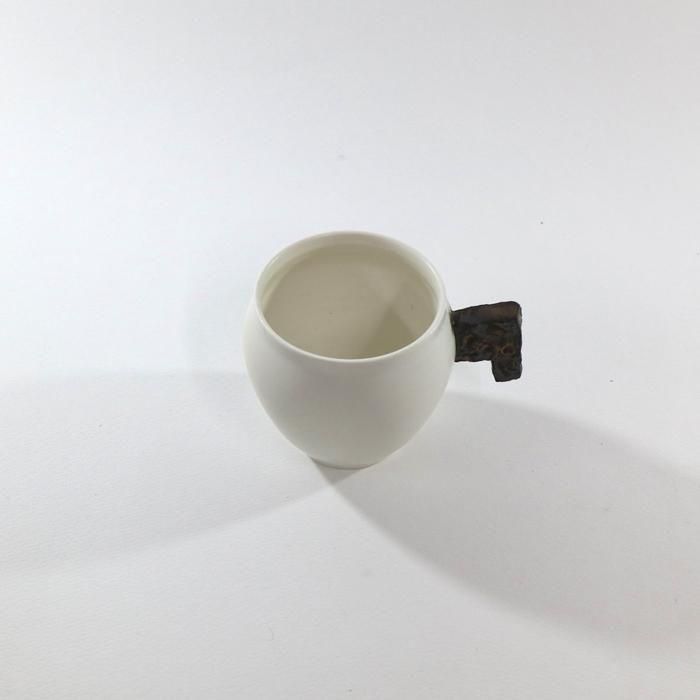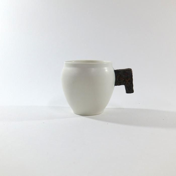 ピースカップ/ヴァーチカルは、卵の殻のような質感の中村かおりさん拘りの「白」の半磁器を珍しいろくろで成形された微妙なニュアンスのある裾に丸みのあるシルエットのボディにブロンズ釉が施釉されて文様の入った鉛直のハンドルのチャーミングなカップです。