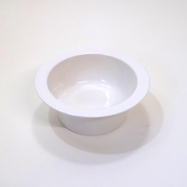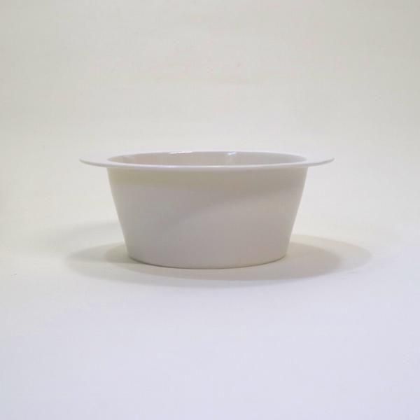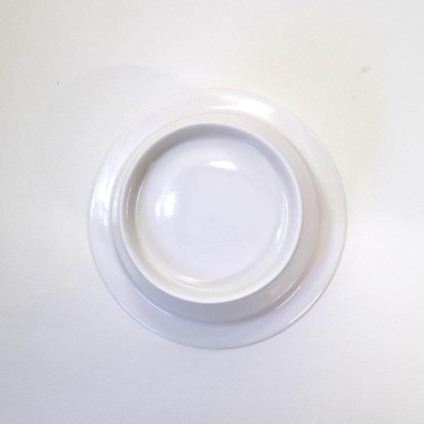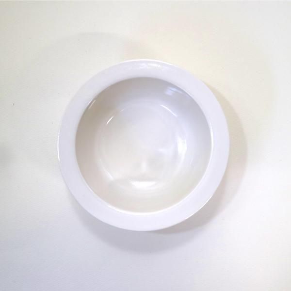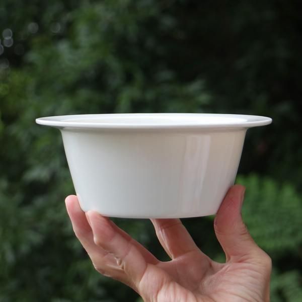 素材の変更に伴い釉薬も調整されて以前の器よりも強度を増した心持ちぽってりしつつ透明感の乳白色のニュアンスのクリーミィホワイトに加え美しい成形(上から見てこれだけ真円に近い美しい円形は類を見ません)の器となっています。