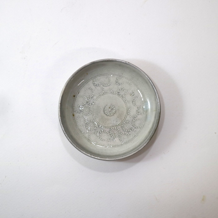 器は、戸津圭一郎さんの白緑三島切立4寸皿です。