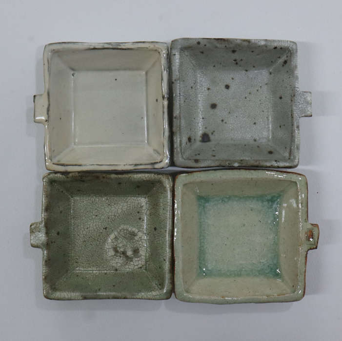 上から粉引ミミツキ角まめ皿、グレー粉引ミミツキ角まめ皿、灰釉ミミツキ角まめ皿、荒山葵ミミツキ角まめ皿となっています。